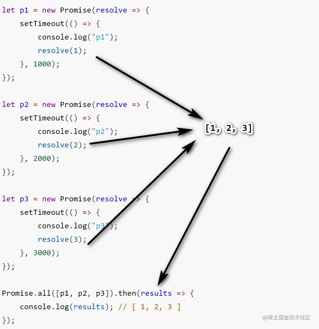 该方法也会返回一个 Promise 对象,它接受一个由 Promise 对象组成的数组,只有当该数组中的所有 Promise 对象都变为 fulfilled 状态之后,返回的 Promise 对象才会变为 fulfilled 状态
