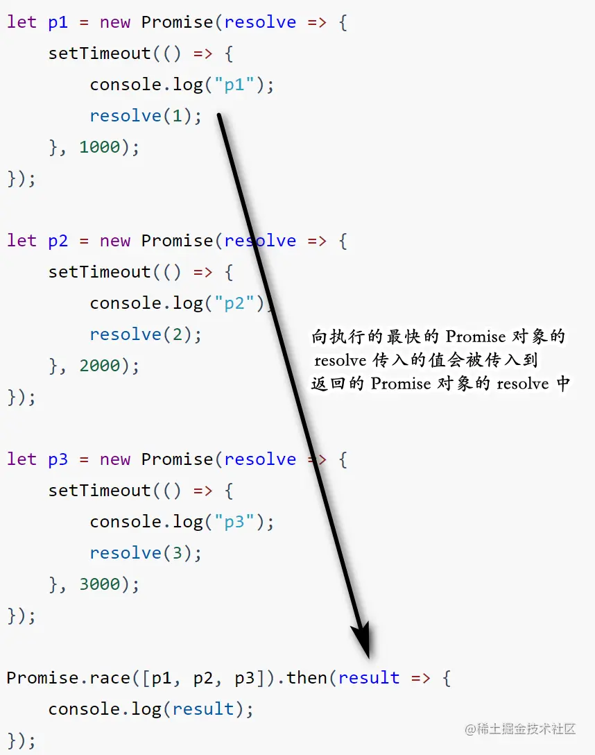 由于 resolve 只会执行一次,只有最先变为 fulfilled 状态的 Promise 对象能将它 resolve 的值传入。