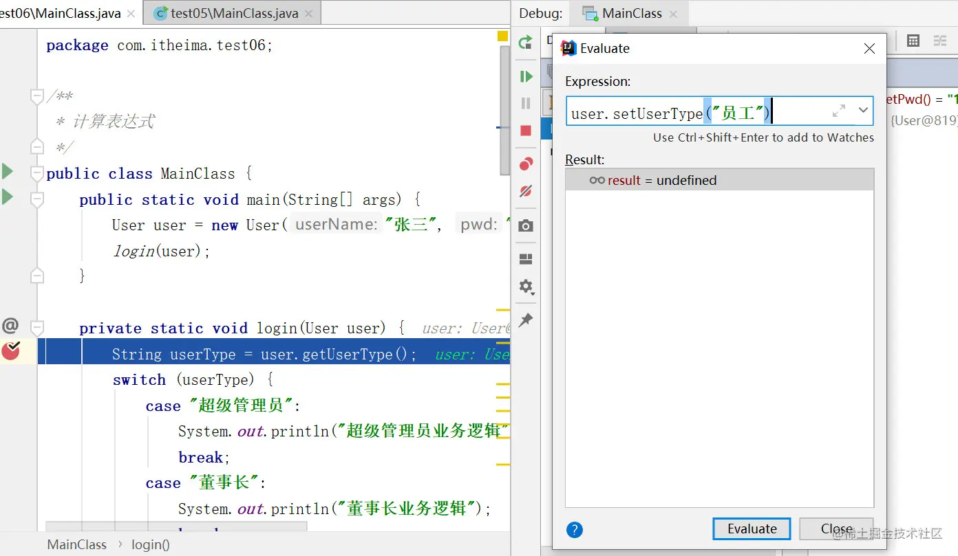 按钮 说明 (Alt + F10):如果你的光标在其它行或其它页面,点击这个按钮可跳转到当前代码执行的行 (F8):步过,一行一行地往下走,如果这一行上有方法不会进入方法。 (F7):步入。如果当前行有方法,可以进入方法内部,一般用于进入自定义方法内,不会进入官方类库的方法。 (Alt + Shift + F7):强制步入,能进入任何方法,查看底层源码的时候可以用这个进入官方类库的方法。 (Shift + F8):步出,从步入的方法内退出到方法调用处,此时方法已执行完毕,只是还没有完成赋值。 回退断点。回退到当前方法的调用处。 (Alt + F9):运行到光标处,你可以将光标定位到你需要查看的那一行,然后使用这个功能,代码会运行至光标行,而不需要打断点。 (Alt + F8):计算表达式。 -