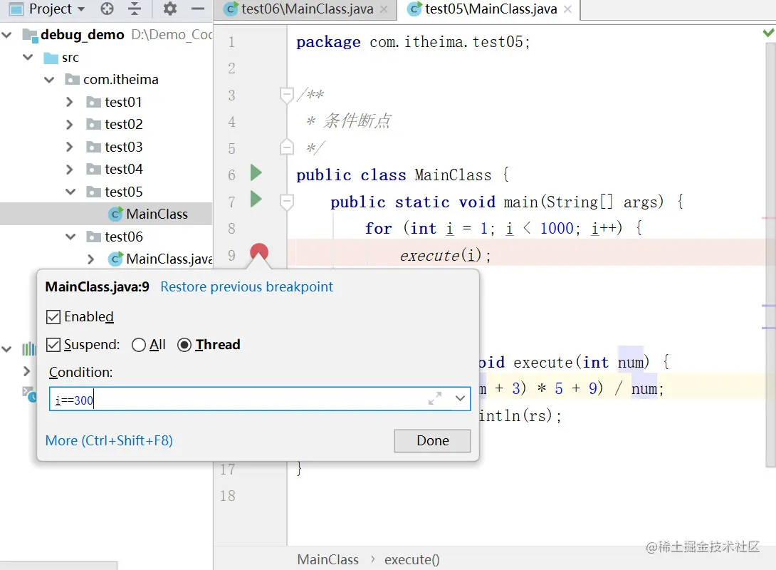 通过设置断点条件,在满足条件时,才停在断点处,否则直接运行。