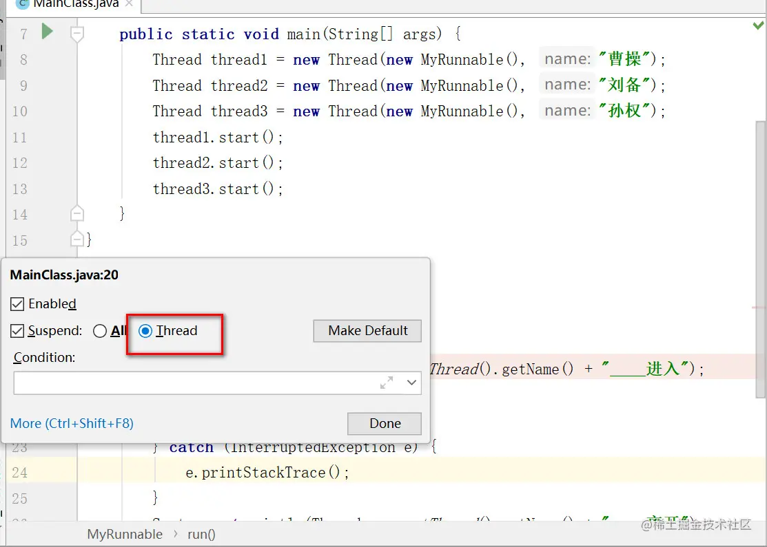 多线程调试,需要调整断点挂起级别为Thread
