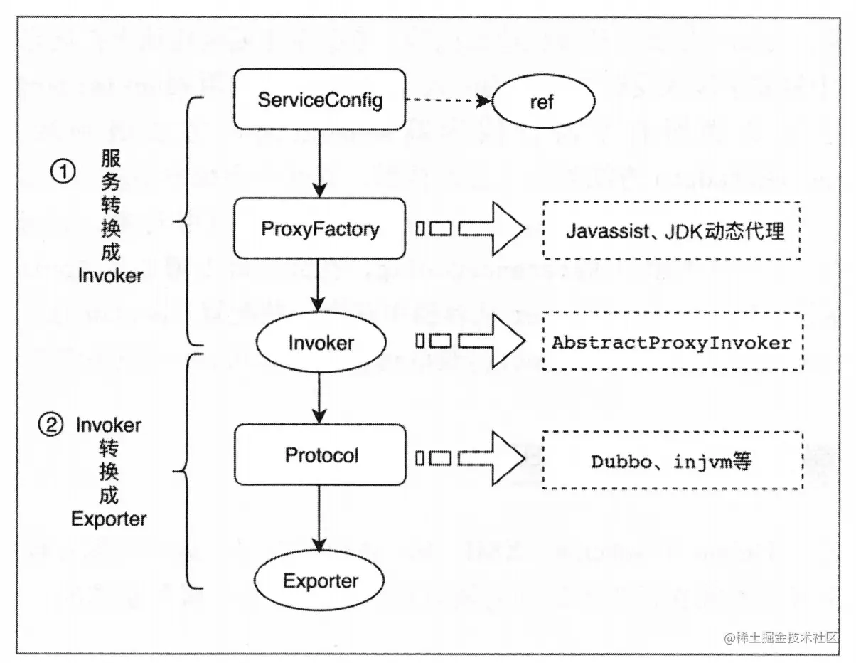 2.通过proxyFactory.getInvoker方法,并利用javassist或DdkProxyFactory来进行动态代理,将服务暴露接口封装成invoker对象,里面包含了需要执行的方法的对象信息和具体的URL地址。