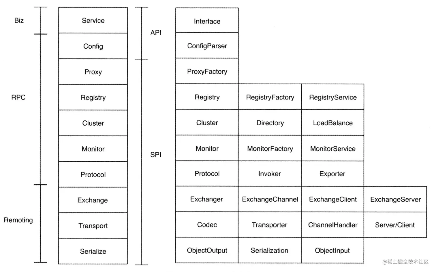 后面所有的层级是SPI层,主 要提供给扩展者使用主要是用来做Dubbo的二次开发扩展功能。