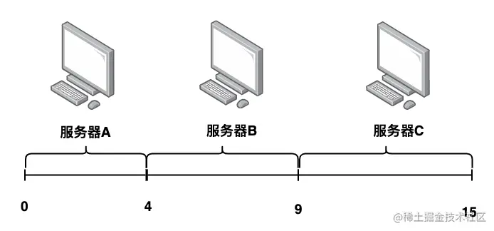 然后在15以内生成一个随机数,0~4是服务器A,4~9是服务器B,9~15是服务器C