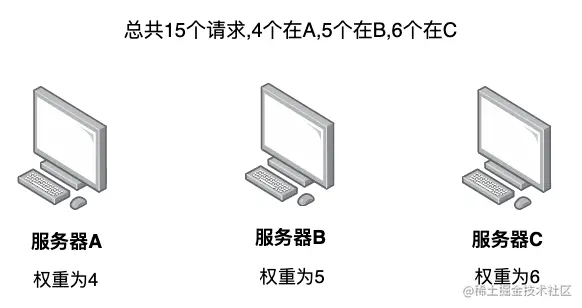 4.加权轮询:比如我们有三台服务器[A, B, C],给他们设置权重为[4, 5, 6],那么假如总共有15次请求,那么会有4次落在A服务器,5次落在B服务器,6次落在C服务器。