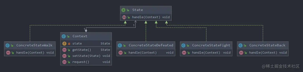State: 状态类,定义一个接口以封装上下文环境的一个特定状态相关的行为,与状态相关的操作委托给具体的state对象进行处理。