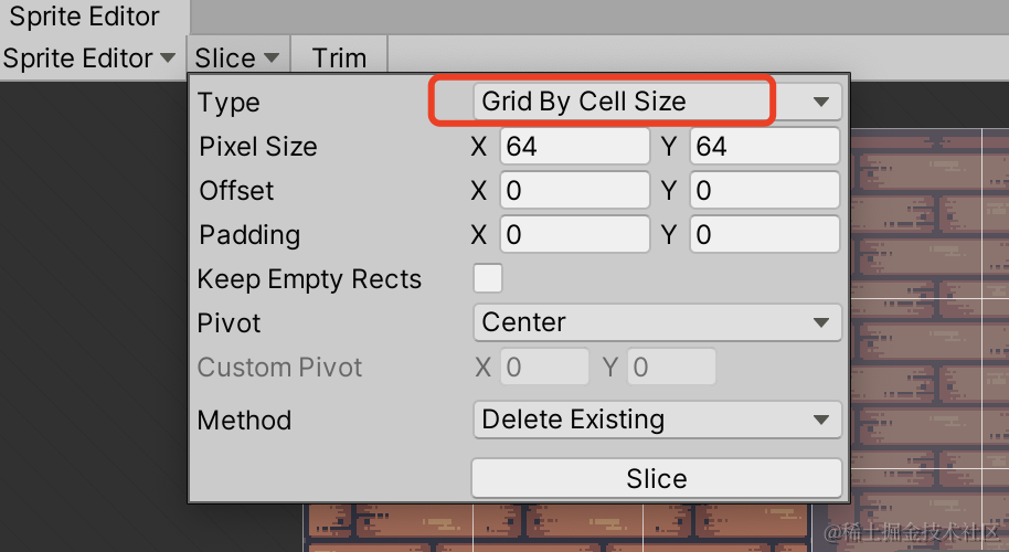 Type -- Grid By Cell Size修改类型按照每一个单元格64x64的尺寸切割- 点击Slice进行切割后点击Apply进行保存