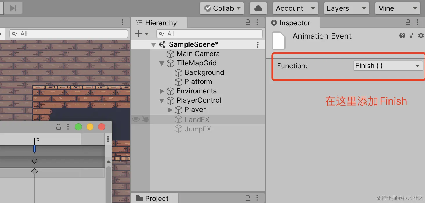 播放完动画之后将游戏物体显示关闭,即在帧动画的最后一帧添加消失的方法Finish。在这里跳跃或者着陆之前启动游戏物体,完成action后就让游戏物体隐藏,同时也节省了资源。