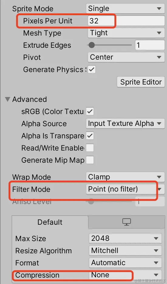 对上面的素材进行统一的参数处理,还是和前面一下,32像素,点采样和无压缩。如下图所示:
