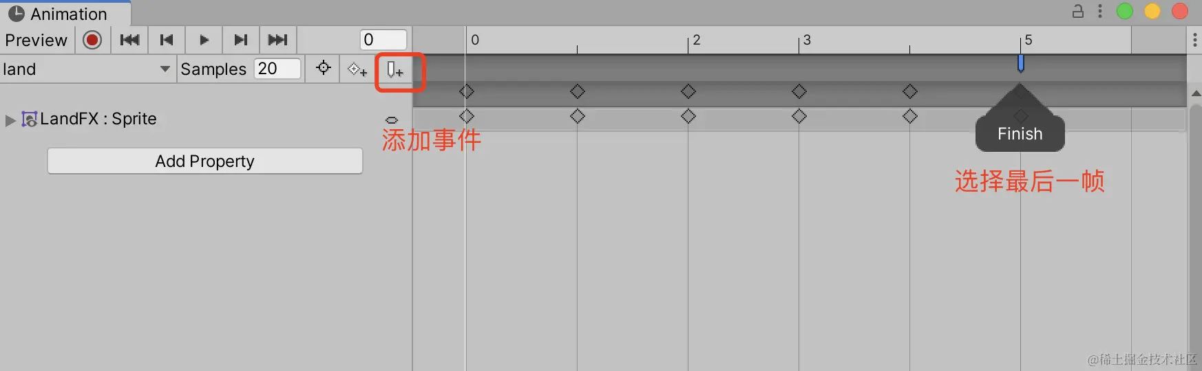为起跳的动画特效也是同样的添加步骤,在最后一帧添加时间FInish。