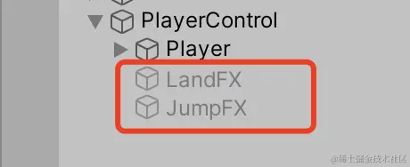 ⚠️但是不能把动画物体LandFX和JumpFX做成Player的子集,虽然这样可以跟着player移动,可他们并不会成为模拟下落或者起跳瞬间出现的特效,比如LandFX就会在player下落以后快速移动时,着陆特效也会跟着一起移动。解决的办法是创建一个集合,把特效和Player放在同级关系如下图。这样挪动PlayerControl就会同时对特效和Player受到影响。