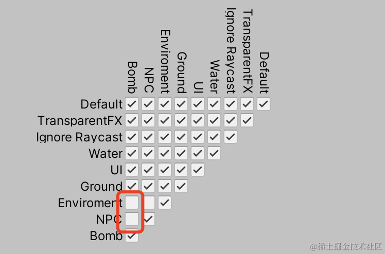 Edit/Project Settings/Physics2D碰撞关系图下取消勾选炸弹与环境和NPC的碰撞关系。这样的话炸弹就不会和环境人物产生碰撞了。
