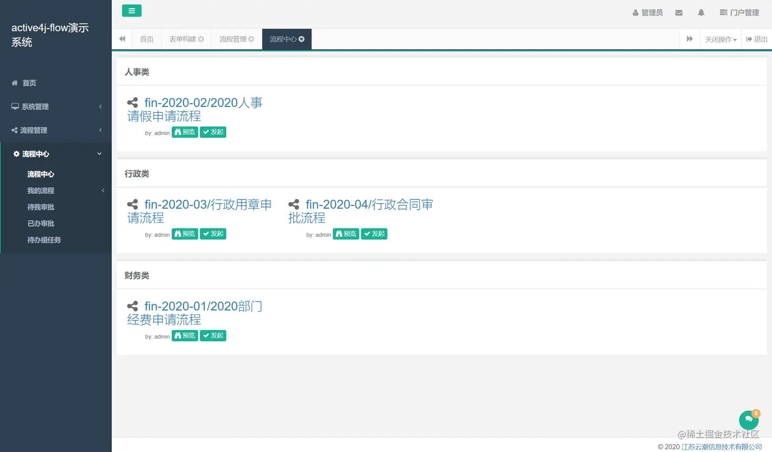 - 在线流程设计器,流程部署,流程定义,表单管理,流程权限管理,流程中心,我的流程,待我审批等基础流程管理功能。