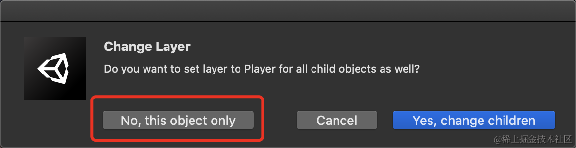 这需要调整Player的碰撞图层并修改碰撞关系。为Layer添加Player,只修改当前层,不修改Player的子物体图层。