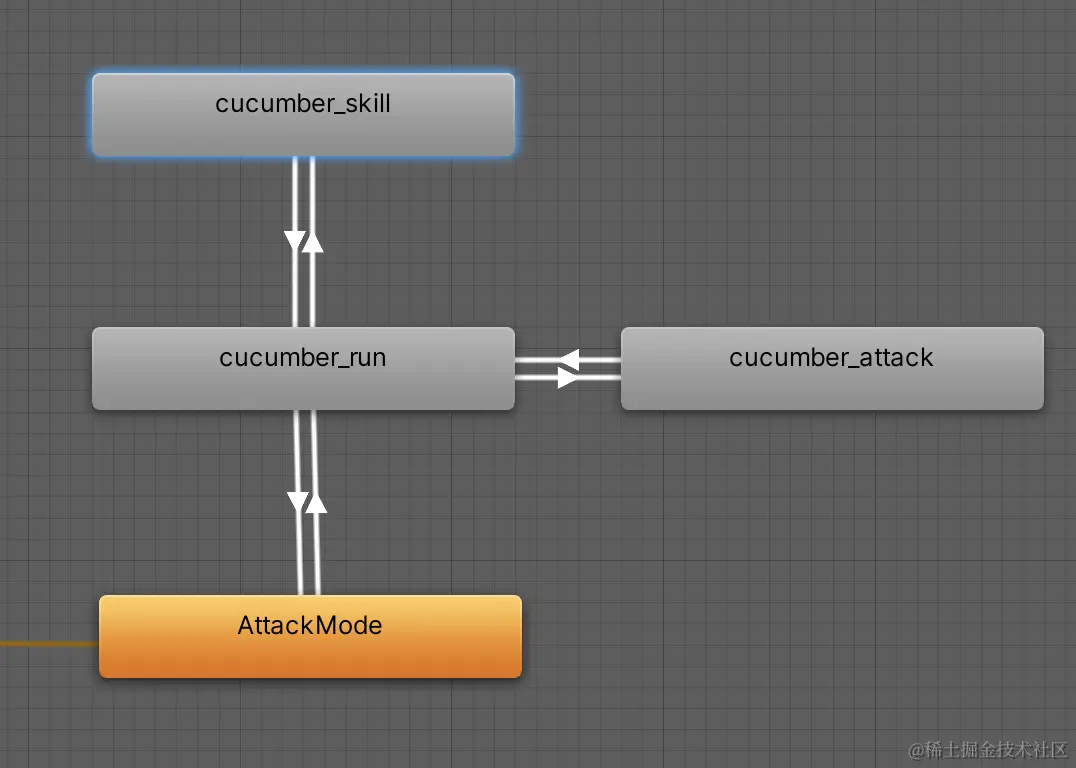 添加Layers命名为AttackLayer,并把它的权重修改为1,表示为完全覆盖上一层的动画。创建进入Layer的状态CreateState–>Empty 命名为(AttackMode),这一状态不为它实装动画片段,用它来代表无论之前是哪一个Layer的动画都可以进入下一个动画的状态,通常使用的时创建一个空的物体方便管理,它代表上一个动画的状态- 攻击状态中的怪物除了跑动以外,还有攻击和skill两个动画,将这两个动画片段添加进状态机