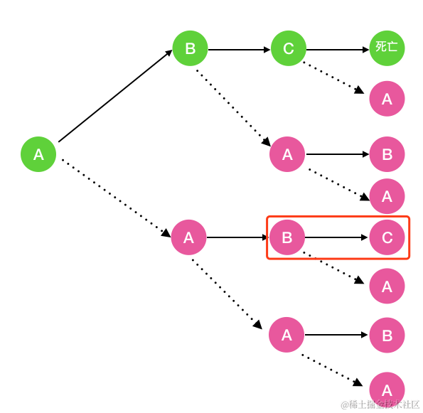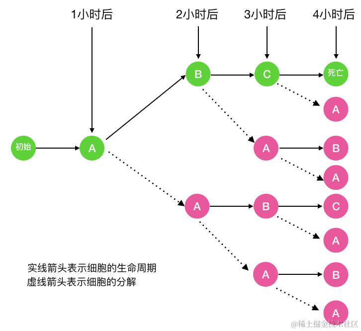 图中的 A 代表细胞的初始态, B代表幼年态(细胞分裂一次), C 代表成熟态(细胞分裂两次),C 再经历一小时后细胞死亡