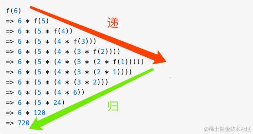 进一步剖析「递归」,先有「递」再有「归」,「递」的意思是将问题拆解成子问题来解决, 子问题再拆解成子子问题,…,直到被拆解的子问题无需再拆分成更细的子问题(即可以求解),「归」是说最小的子问题解决了,那么它的上一层子问题也就解决了,上一层的子问题解决了,上上层子问题自然也就解决了,…,直到最开始的问题解决,文字说可能有点抽象,那我们就以阶层 f(6) 为例来看下它的「递」和「归」。
