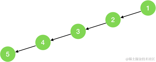 最坏情况,如果此二叉树是如图所示(只有左节点,没有右节点),则树的高度即结点的个数 n,此时空间复杂度为 O(n),总的来看,空间复杂度为O(n)