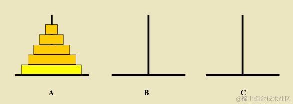 显然时间复杂度为 O(2n),很明显指数级别的时间复杂度是不能接受的,汉诺塔非递归的解法比较复杂,大家可以去网上搜一下