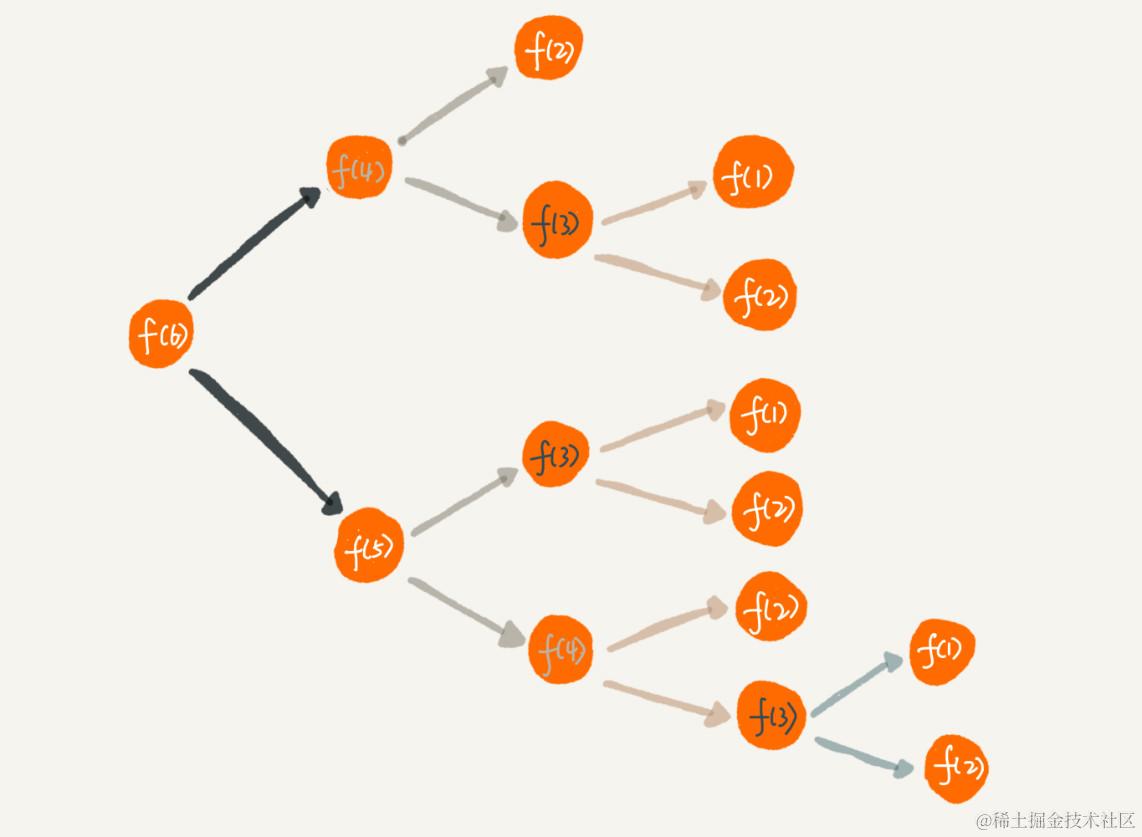 由些可知时间复杂度是指数级别,显然不可接受,那回过头来看为啥时间复杂度这么高呢,假设我们要计算 f(6),根据以上推导的递归公式,展示如下