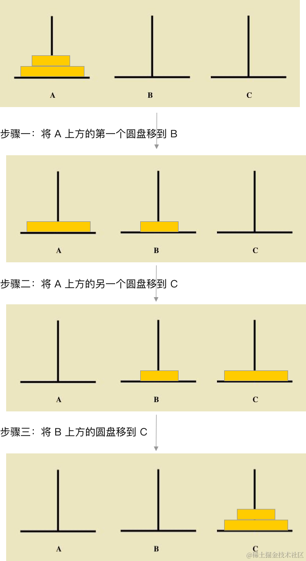 首先我们看如果 A 柱子上只有两块圆盘该怎么移