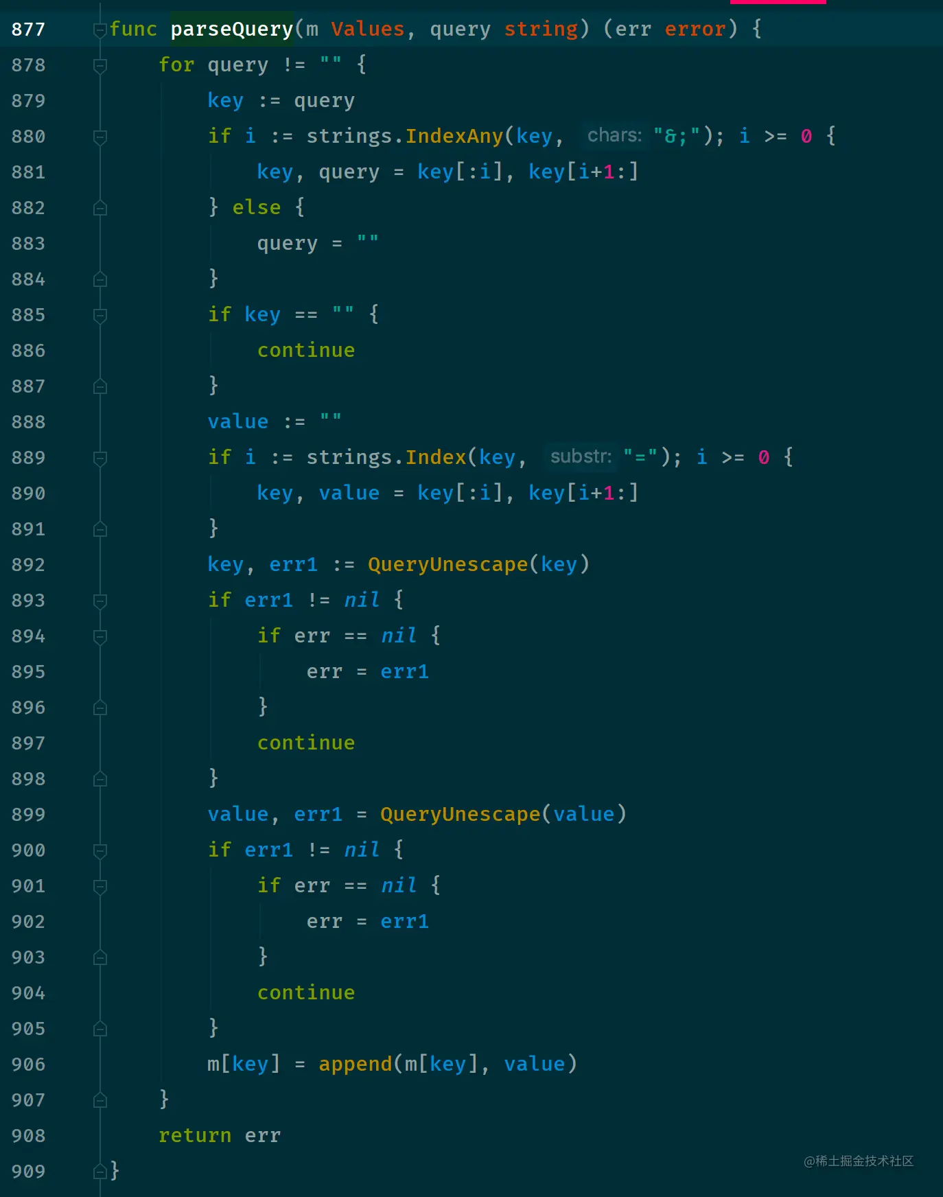 在 gin 内部是通过 parseQuery 方法来解析的,从返回值也可以看出是一个以 string 为 key,string 数组为值的 map