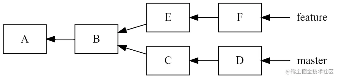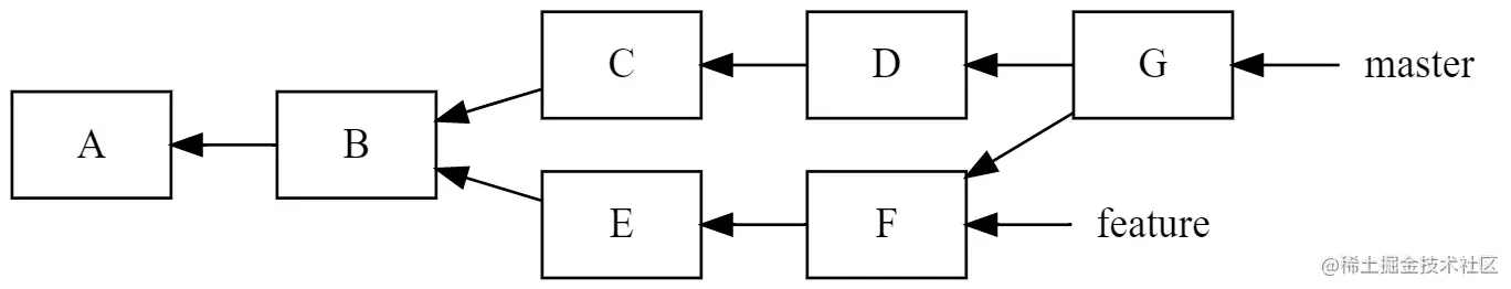 对应到上面这张图片,其中的 A、B、C……F 就是 Commit Object,而 master、feature 这样的分支其实就是一个指向 Commit Object 的 Ref Object。