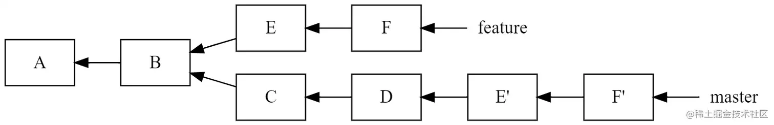 merge 通过创建一个新的 Commit Object 来保留两边的修改,而 rebase,则会将 E、F 的修改在 master 分支上重放,创建对应的一串新的 Commit Object: