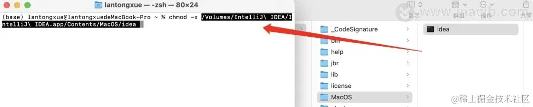 这时你需要打开终端输入xattr -r -d ,注意字母d后面有一个空格,然后将安装包里的安装文件拖动到终端里,按下回车执行,还是以IDEA为例