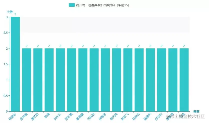 然后对name,嘉宾名字进行个数(参加过多少次)统计排名(取前15)
