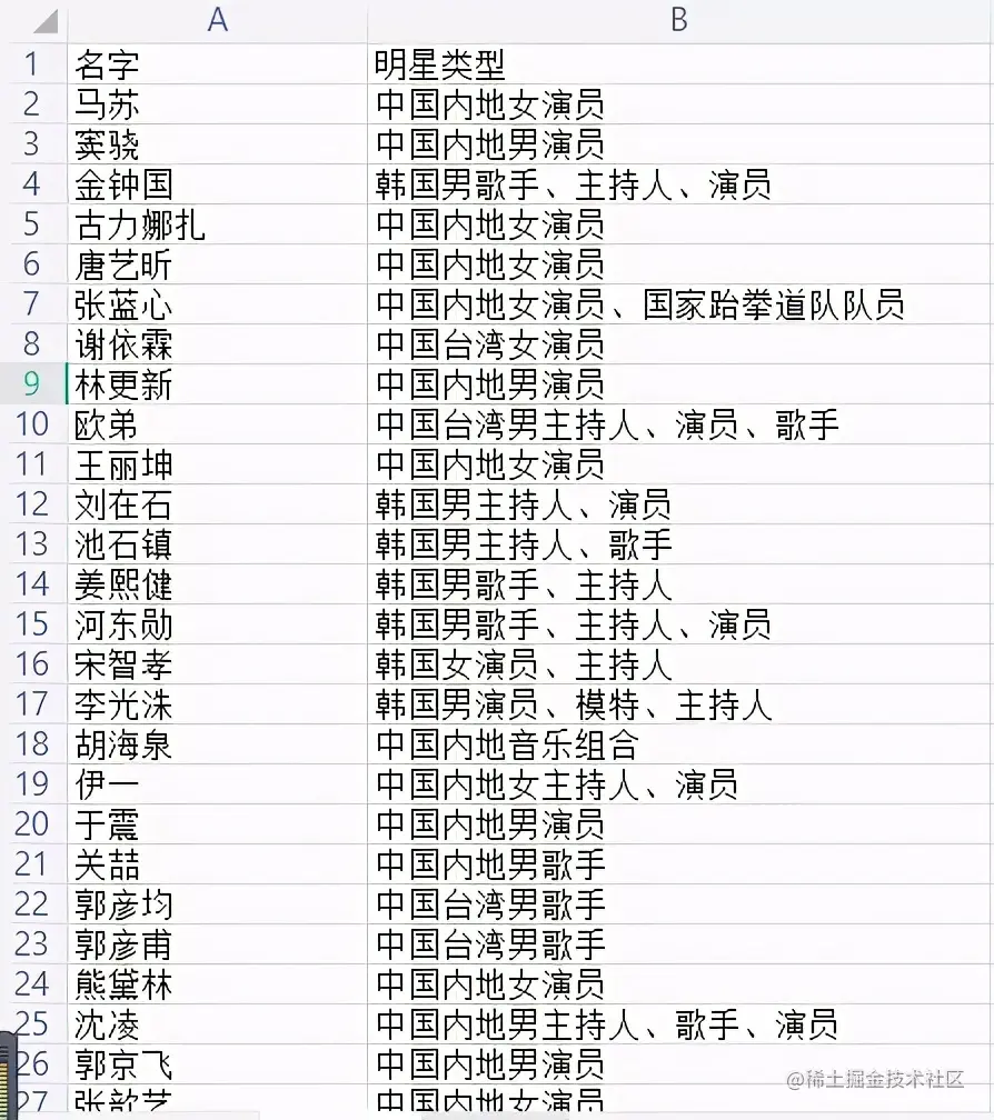 首先读取excel中数据,其中名字(第一列)存放在name变量中,明星类型(第二列)存放在types变量中。