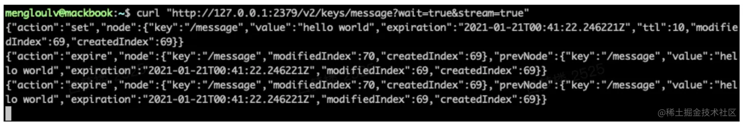 curl "http://127.0.0.1:2379/v2/keys/message?wait=true&stream=true"