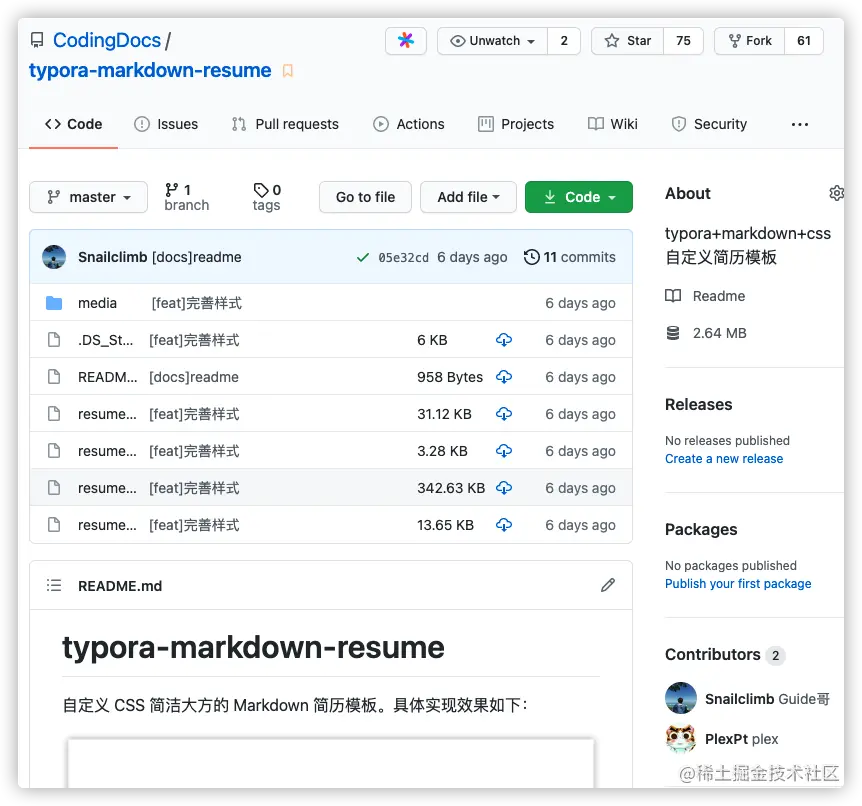 项目地址:github.com/CodingDocs/… (欢迎小伙伴们使用!个人能力有限,也欢迎小伙伴们一起完善这个简历模板!)。