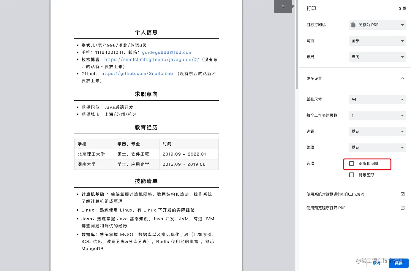 为此,我写了一个自定义 CSS 简洁大方的 Markdown 简历模板。具体实现效果如下(可以根据自身的情况适当调整。项目已开源,欢迎一起完善):