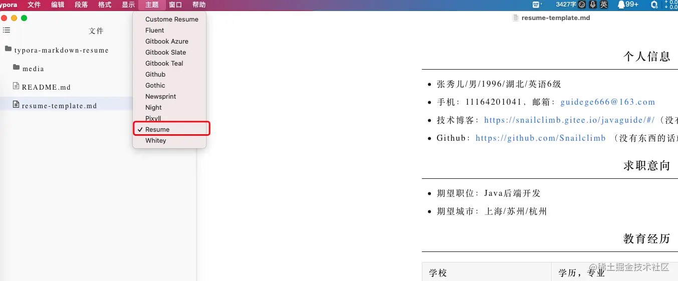 3) 打开 resume-template.md,然后选择我们的自定义主题即可