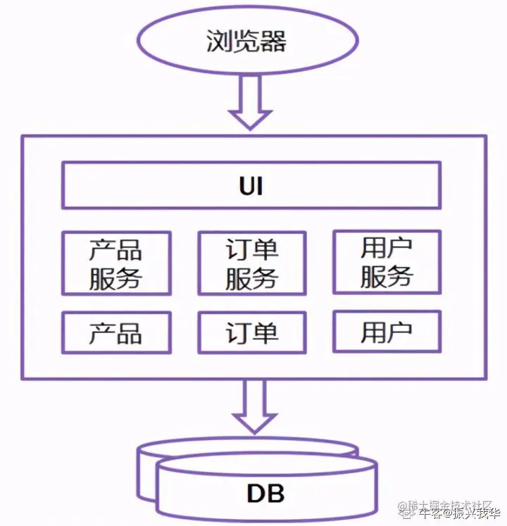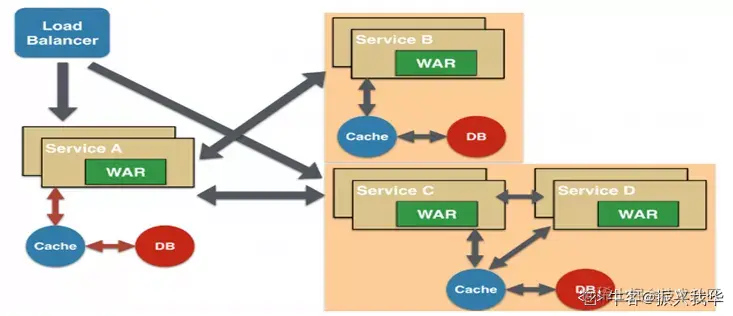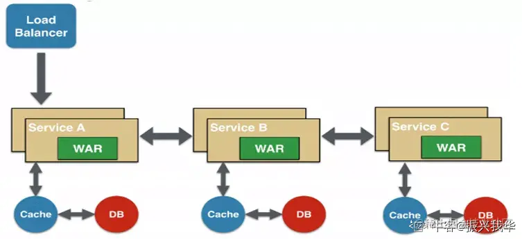 所有的功能打包在一个 WAR包里,基本没有外部依赖(除了容器),部署在一个JEE容器(Tomcat,JBoss,WebLogic)里,包含了 DO/DAO,Service,UI等所有逻辑。