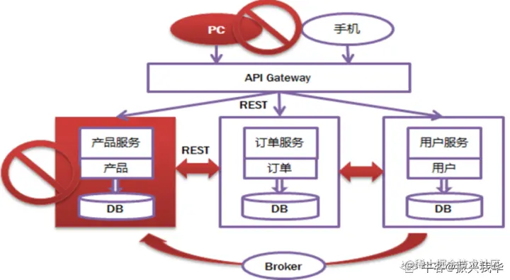 虽然REST设计模式非常流行,但它是同步的,会造成阻塞。因此部分基于微服务的架构可能会选择使用消息队列代替REST请求/响应,如下图所示:
