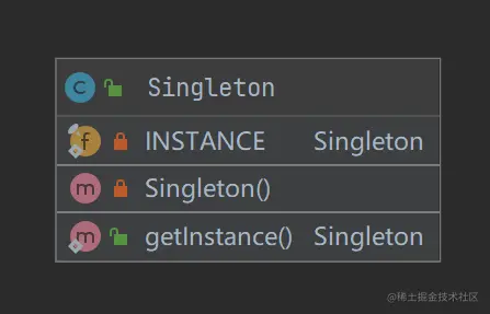 INSTANCE,保证只有一个实例对象; - 一个私有的构造器