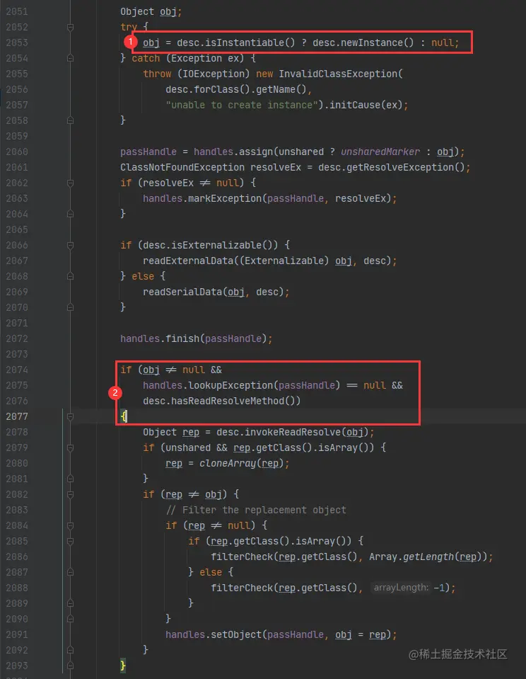 这个方法里面,最重要的两块代码,我圈出来了。第一块其实就是我们在没有加入 readResolve()