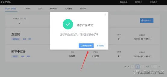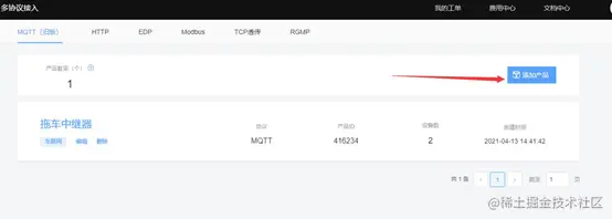 如上图,点击添加产品,onenet平台MQTT协议框架下分为产品ID和设备ID,可以建立多个不同的产品,每个产品拥有不同的设备,设备以ID号进行区分。