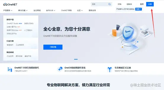 - 在接入 OneNet 之前,需在平台网站注册用户账户,登陆网址:open.iot.10086.cn/,显示如下界面: