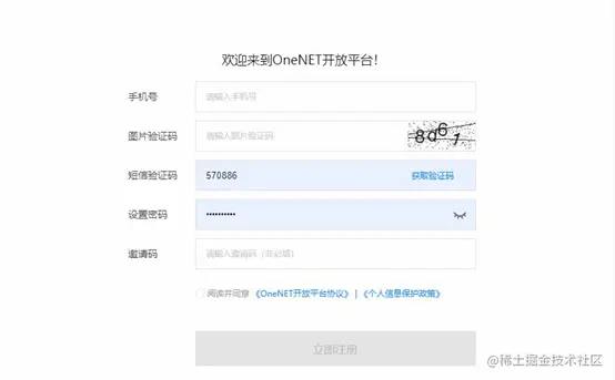 - 最后将用户数据按照一定的协议(比如:EDP、RestFul API,MQTT)打包上传至 OneNet 平台,从而实现设备终端接入。 用户注册: