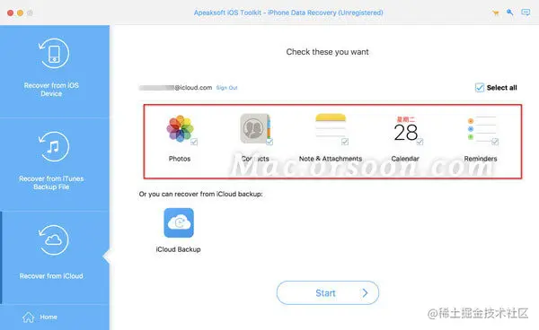 您还可以选择要从iCloud恢复的数据类型,例如“联系人”,“便笺”,“提醒”,“照片”等。之后,单击“开始”按钮以扫描iCloud数据。