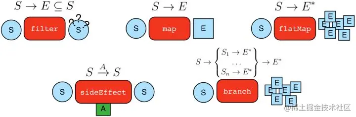 - branch:拆分遍历器并将其发送到遍历中的任意位置(S→{S1→E^*,…,S_n→E^*_S_1→_E_∗,…,_Sn_→_E_∗}→E*)。