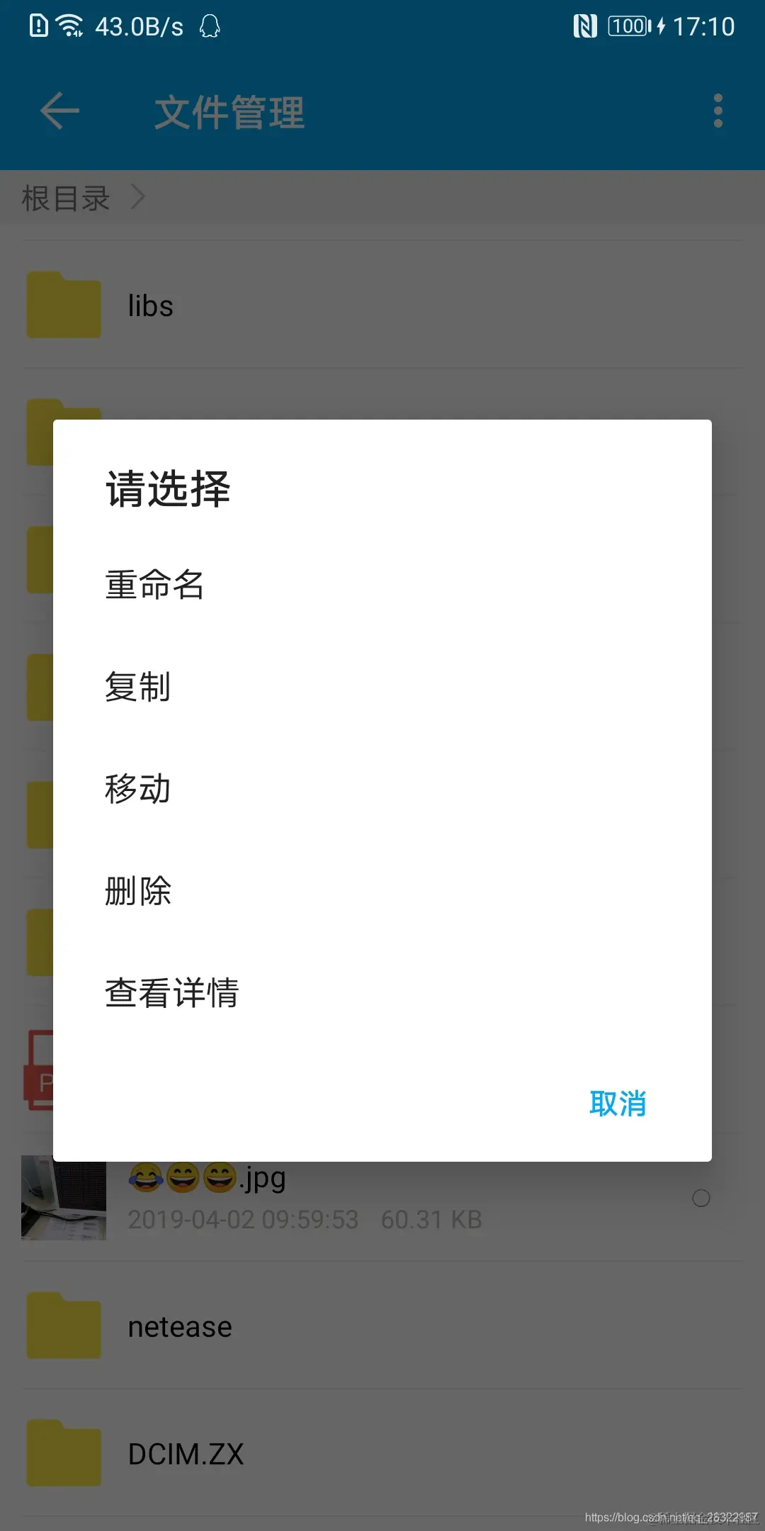 - 支持音频、视频播放,图片查看,zip解压,文件重命名、复制、移动、删除、查看详情