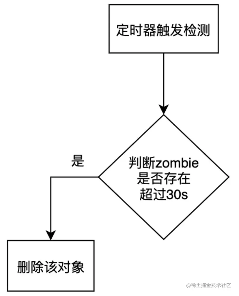 同样借鉴LRU最近最久未使用的逻辑,每隔30s会检测下缓存情况,超过30s还未被使用的zombie对象将被删除,30s是一个经验值,通过大量测试发现,内存问题一般会发生在对象被销毁的30s内,超过30s再出现的概率及小。这样可以做到缓存自清理的逻辑。