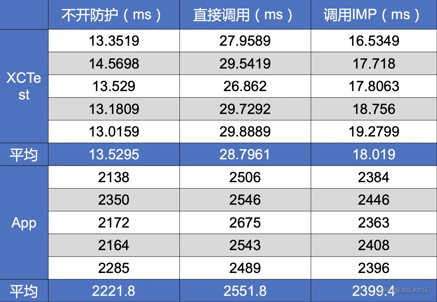 最终我对直接调用IMP的方法做了测试,分别是Demo中和App中的某一个场景,测试数据如下,对比结果还是较为明显。这也就是为什么Swift或者一些其他静态语言比OC快的原因。