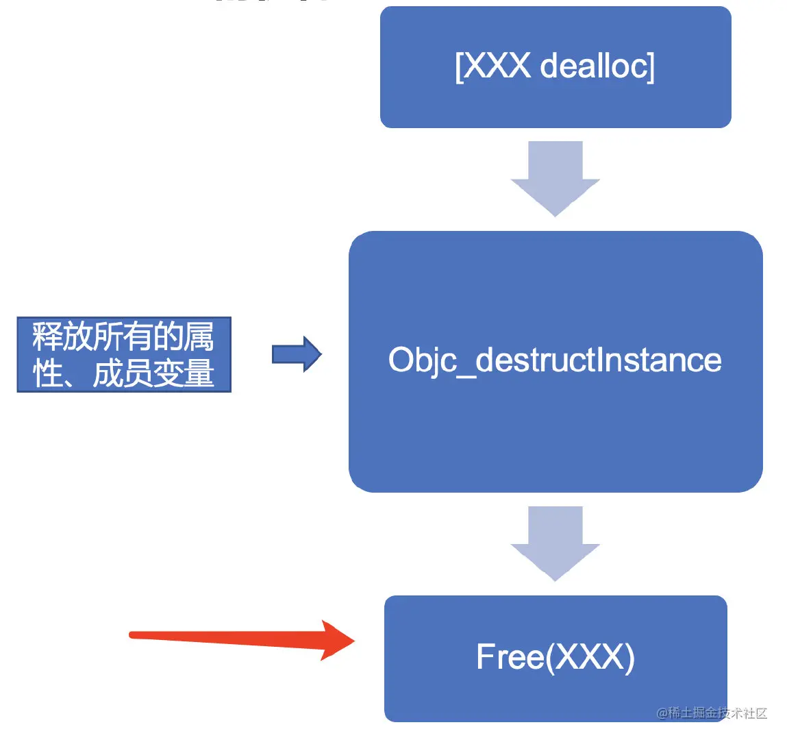 Objc_destructInstance,所有的成员变量、属性都会在这个函数中释放,如果漏掉这个函数就会生成一个并不干净的僵尸对象,内存占用过高,白白浪费内存空间。