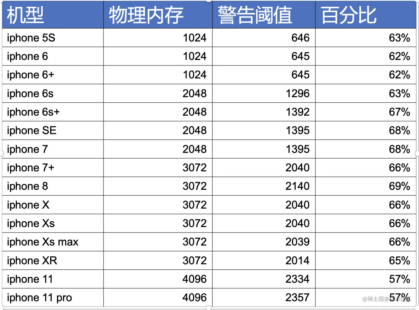 我们的底线是在加入zombie后不能触发memorywarning,所以我先对大部分机型做了memorywarning阈值测试: