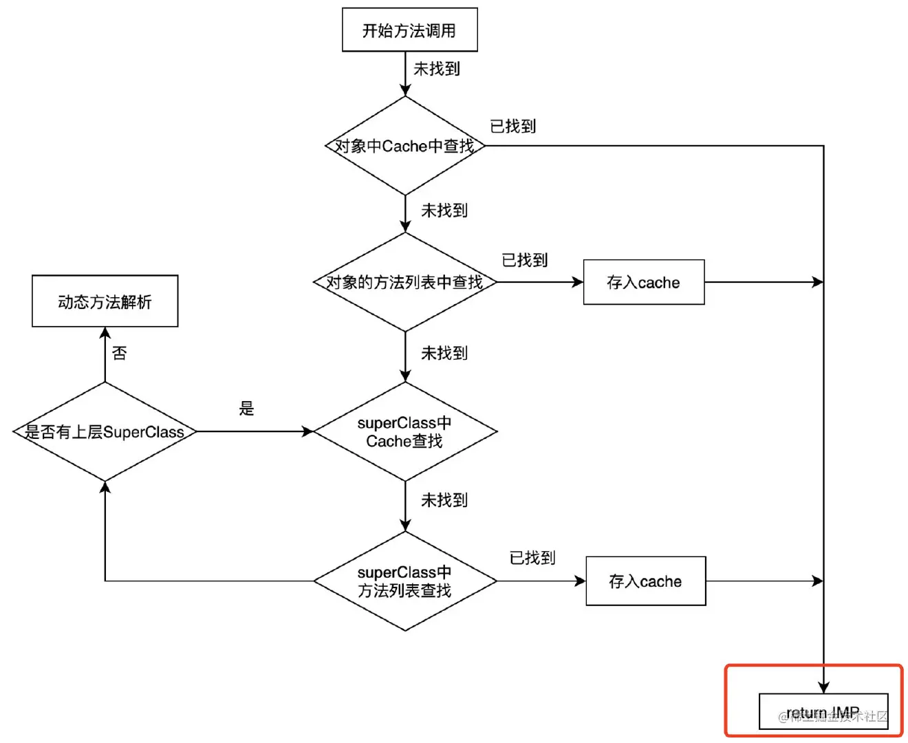 通过上图看出,方法调用流程最终会返回出对应的IMP指针供外部调用,作为动态语言,OC无法确定开发者会再什么时候插入或者交换哪个函数,所以必须通过这一套流程进行类似校验的逻辑。